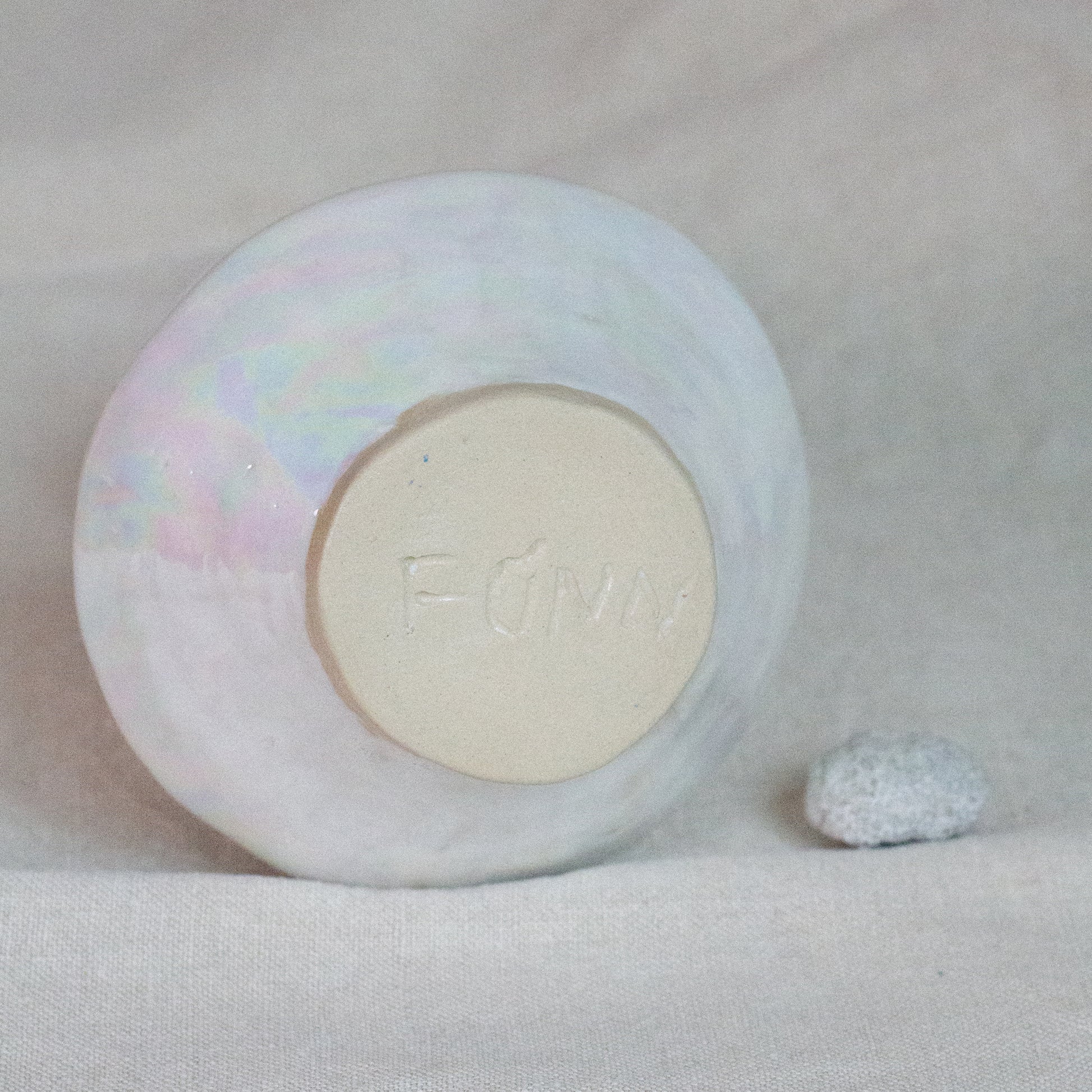 Small handbuilt ceramic vase with iridescent mother of pearl exterior and white interior. Features classic shape with unique variations. Each piece in the series has different contours, shape and textures, creating distinctive light play with shifting pearlescent colors. Use as decor or for flowers. Hand wash only.