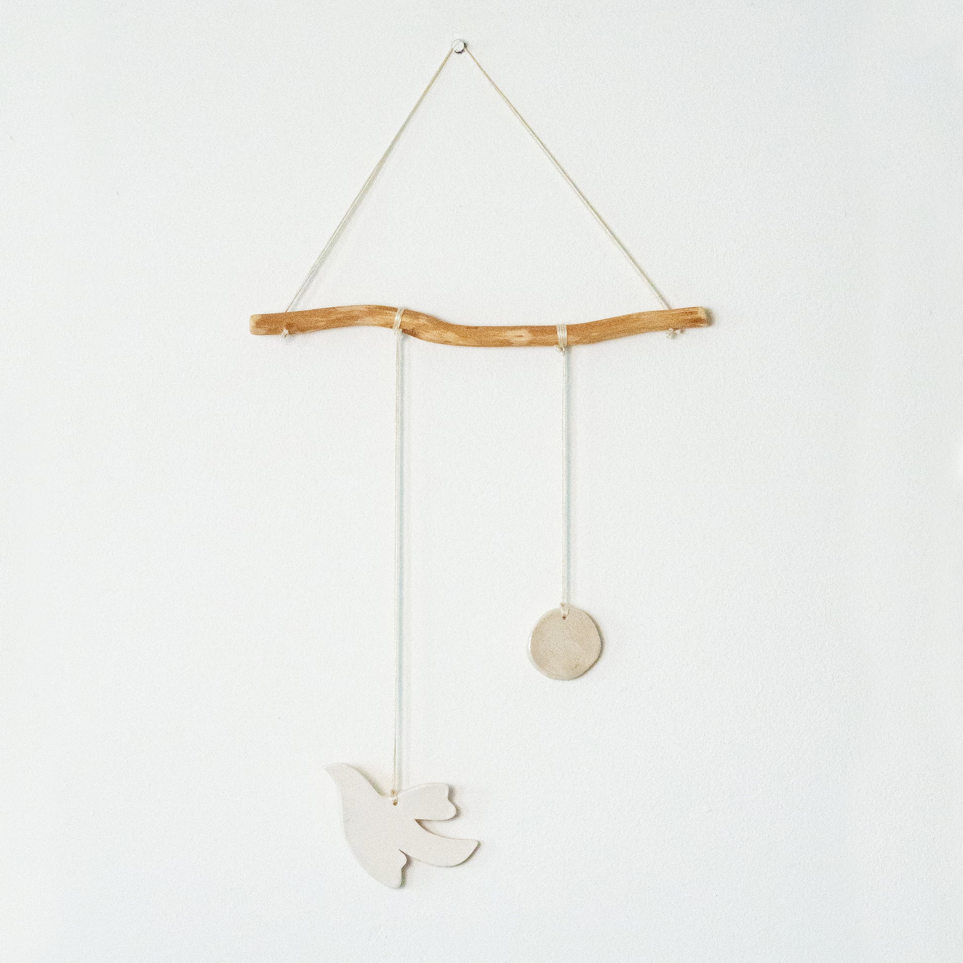 Handgefertigtes Keramik-Mobile mit Vogel- und Vollmond-Motiv. Aus natürlichem Ton mit verschiedenen Oberflächen – teilweise transparent glasiert mit Perlmutt-Lüster, teilweise unglasiert. Hängt an einem geschnitzten Zweig mit Baumwollfaden und zeigt die Schönheit natürlicher Materialien und organischer Formen.