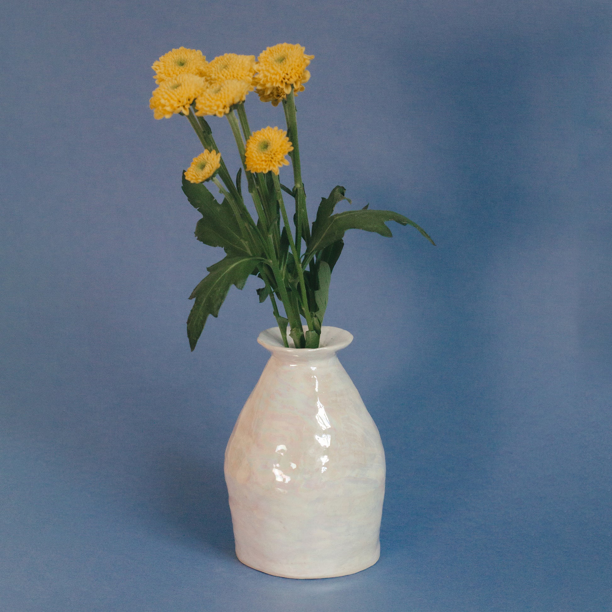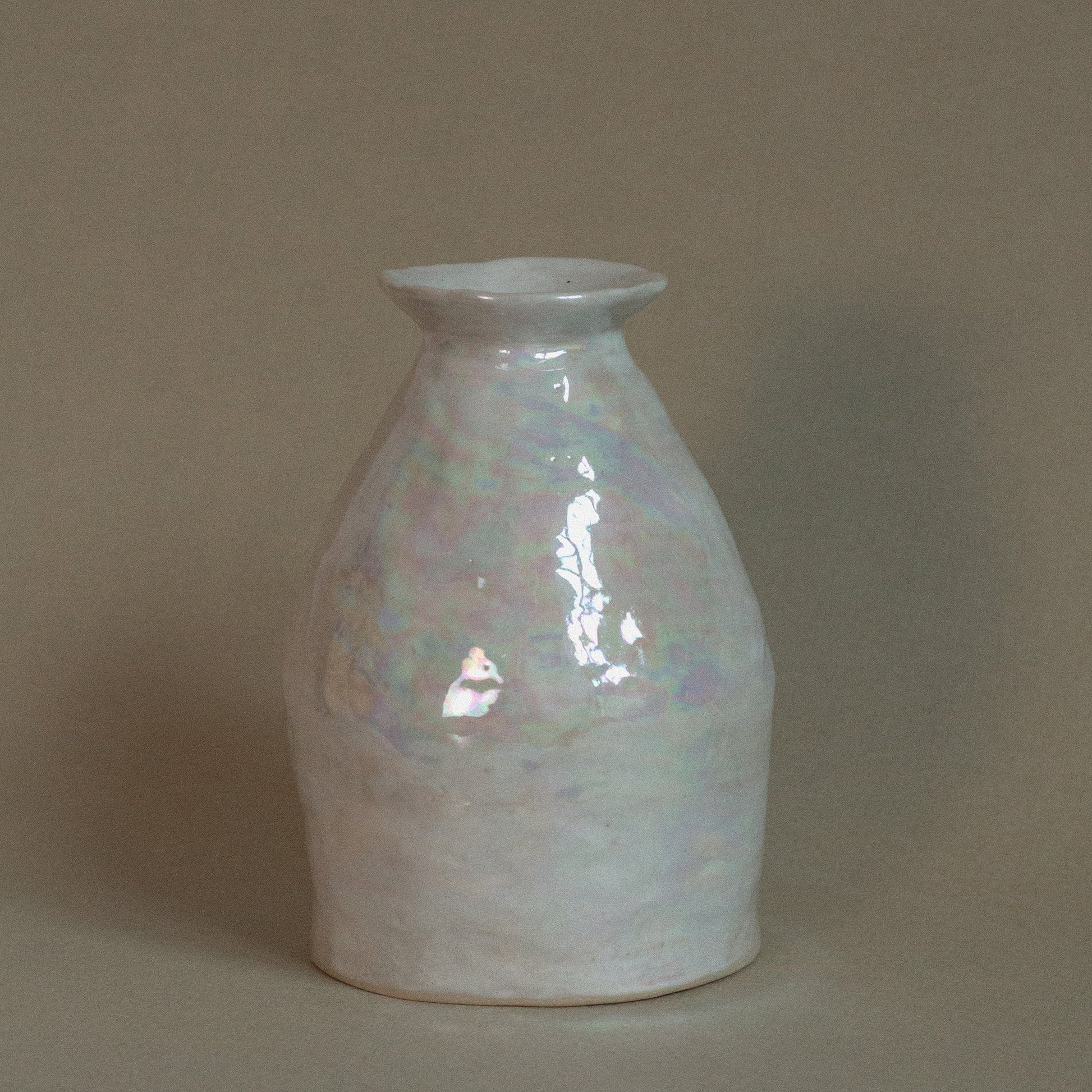 Small handbuilt ceramic vase with iridescent mother of pearl exterior and white interior. Features classic shape with unique variations. Each piece in the series has different contours and textures, creating distinctive light play with shifting pearlescent colors. Use as decor or for flowers. Hand wash only.