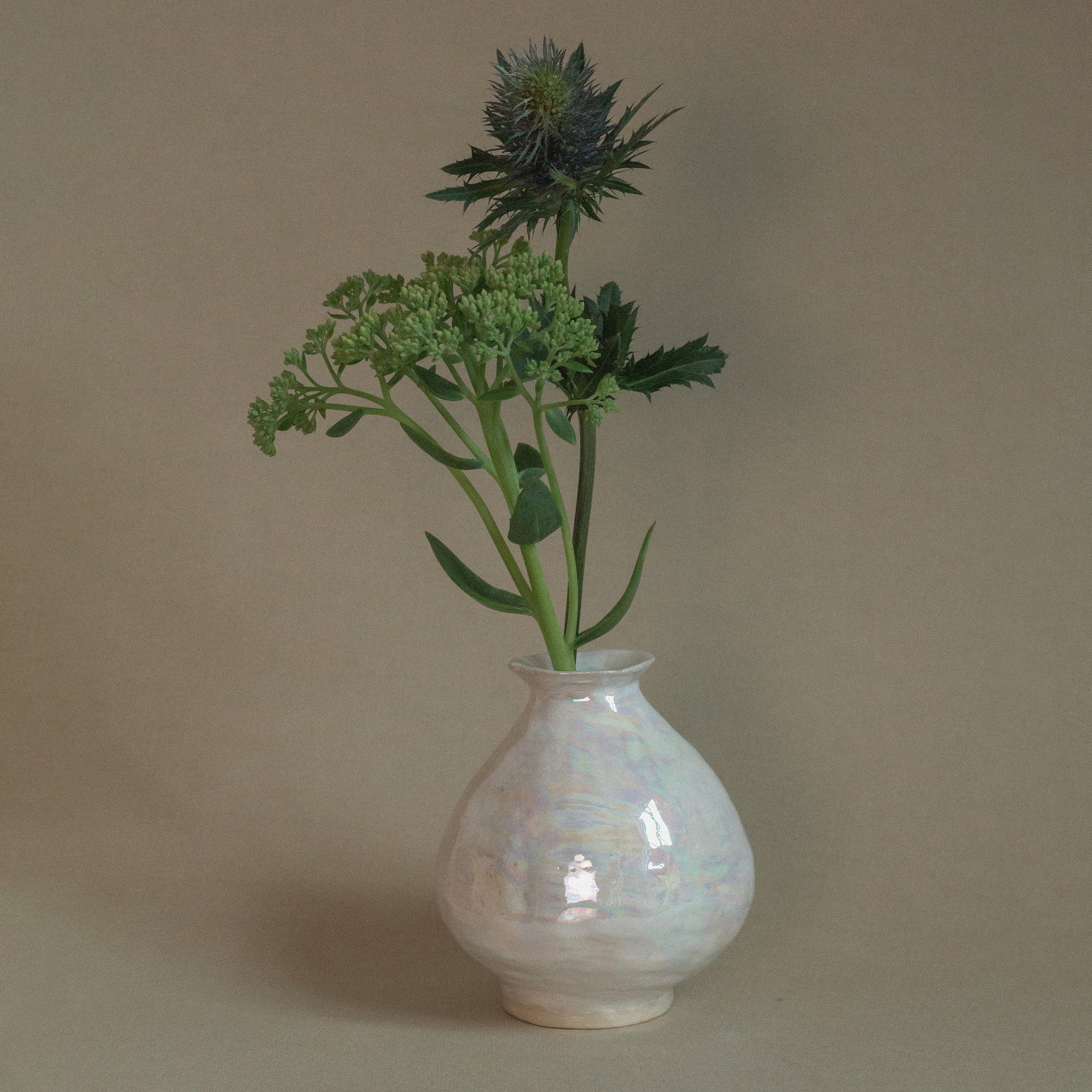 Small handbuilt ceramic vase with iridescent mother of pearl exterior and white interior. Features classic shape with unique variations. Each piece in the series has different contours, shape and textures, creating distinctive light play with shifting pearlescent colors. Use as decor or for flowers. Hand wash only.